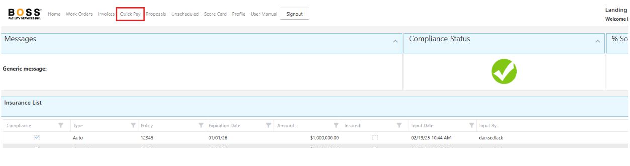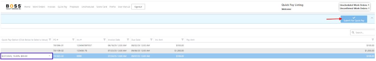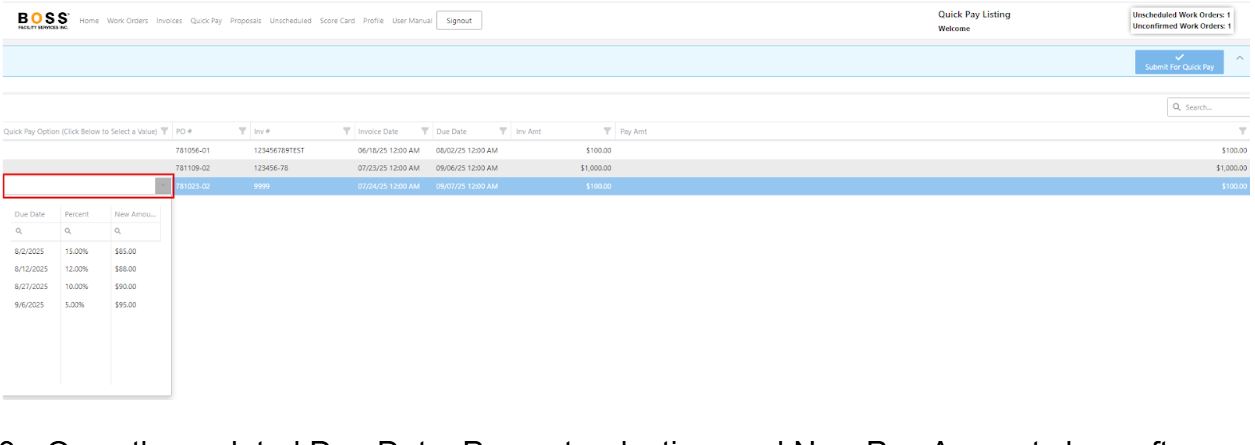 Select the drop-down box under “Quick Pay Option” for the invoice you would like to receive expedited payment on.