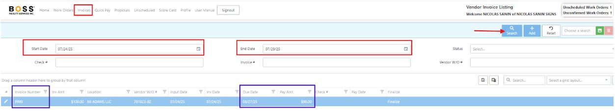 Invoices can be reviewed in the “Invoices” tab of the portal. If you do not see an uploaded invoice, try expanding the “Start” and “End” dates (date of invoice upload) and then click search.